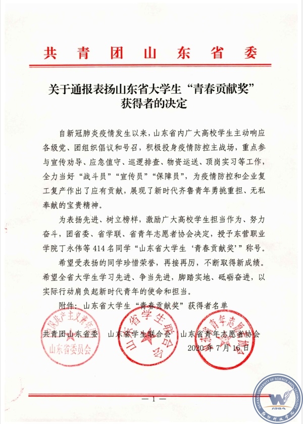 近日,共青团山东省委、省学联、省青年志愿者协会联合开展的山东省大学生“青春贡献奖”评选活动结果公布,全省414名青年大学生受到表彰。我校经济管理学院2018级会计专业学生王鹏程、贾思勰农学院2017级园艺专业学生徐靖淋等2名同学获山东省大学生“青春贡献奖”荣誉称号。