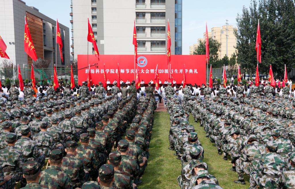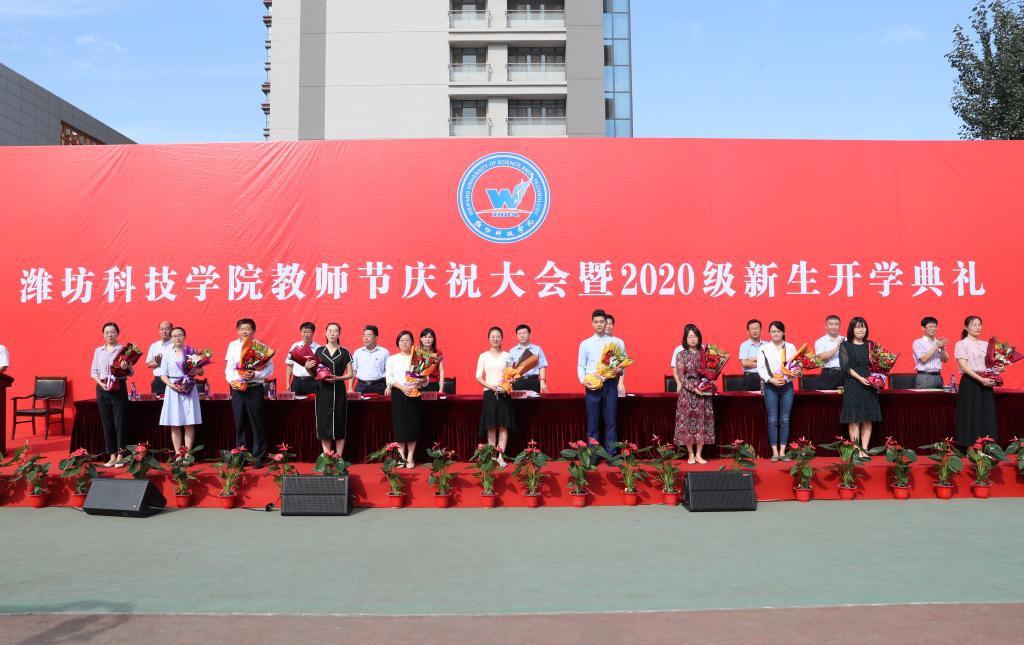 9月10日上午,我校在闻达体育场隆重举行第36个教师节庆祝大会暨2020级新生开学典礼。寿光市人大常委会副主任、校长李昌武,校党委书记李凤祥及全体校领导参加典礼并为受表扬的优秀教师代表颁奖。李昌武代表学校对新同学的到来表示热烈欢迎!对辛勤工作的老师们致以节日的祝福!对受到表扬的教职工表示衷心的祝贺!李凤祥为军训总教官宋更胜授旗。副校长慈建华宣读《潍坊科技学院关于表扬2019—2020学年先进个人的决定》。